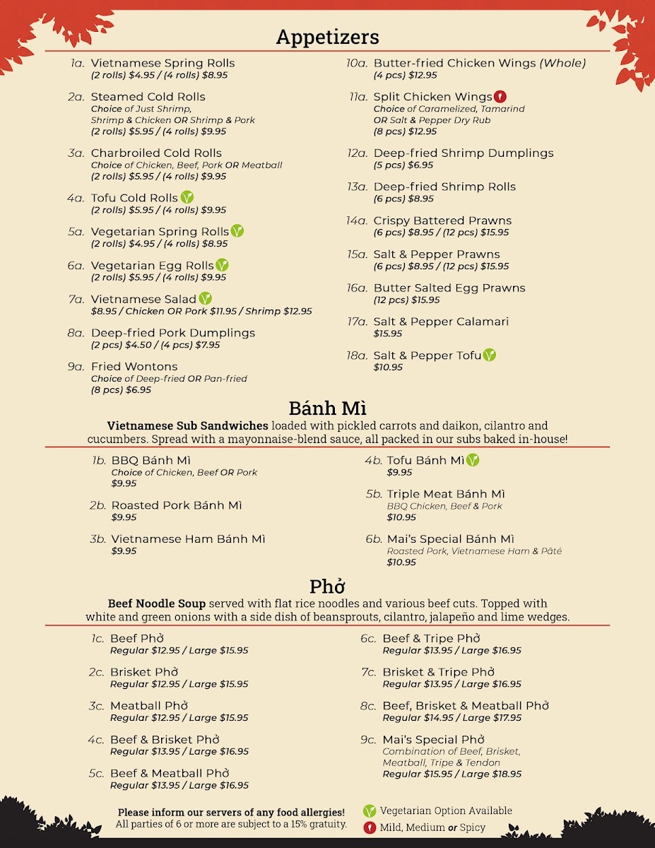 Welcome to Mai's Kitchen Vietnamese Cuisine, a vibrant culinary gem nestled in Saskatoon, offering a genuine taste of Vietnam. The menu features an enticing array of dishes that highlight traditional flavors and fresh ingredients, ensuring a delightful dining experience.